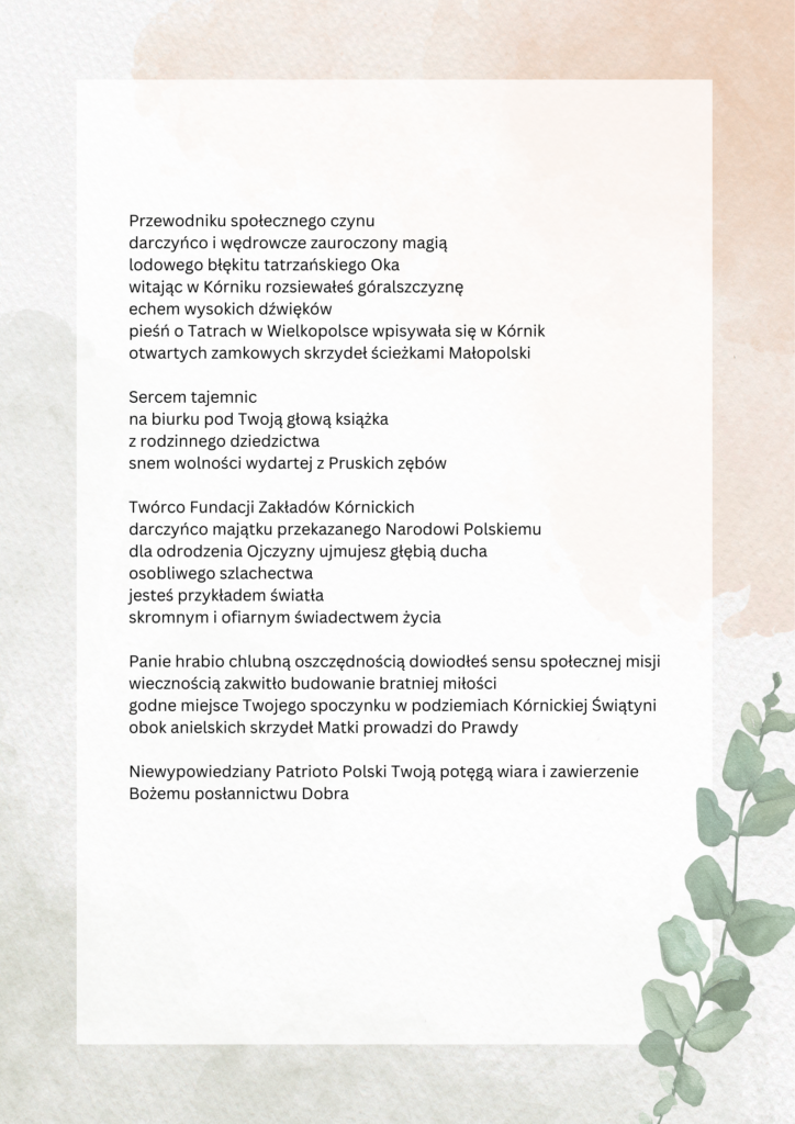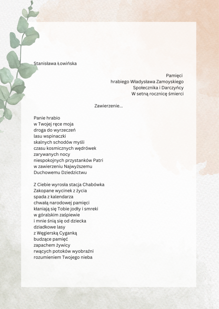 Stanisława Łowińska „Zawierzenie…”, wiersz pamięci hrabiego Władysława Zamoyskiego.