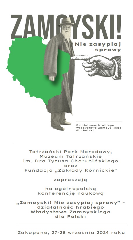 Tatrzański Park Narodowy, Muzeum Tatrzańskie im. Dra Tytusa Chałubińskiego oraz Fundacja „Zakłady Kórnickie” zapraszają na ogólnopolską konferencję naukową „Zamoyski! Nie zasypiaj sprawy” – działalność hrabiego Władysława Zamoyskiego dla Polski.
